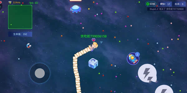 在地图里还会碰到其他玩家操控的小蛇,要是头部撞到别的小蛇也会丧命。想消灭对方的蛇,得用自己的身体去撞,消灭之后能吃掉敌蛇掉落的豆子,这样就能让自己的身体变长。