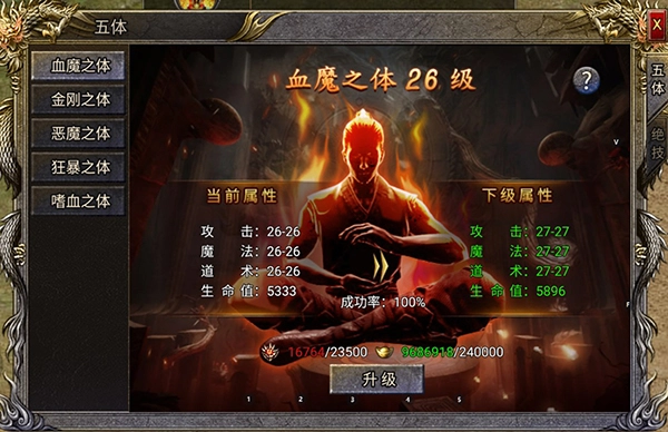 勇士进入游戏后,五体系统会自动解锁,点击右下方的“五体”按钮即可进入升级界面。五体系统包含血魔之体、金刚之体、恶魔之体、狂暴之体和嗜血之体五个部分,它们分别对应提升生命、防御、攻击、暴击和吸血属性。