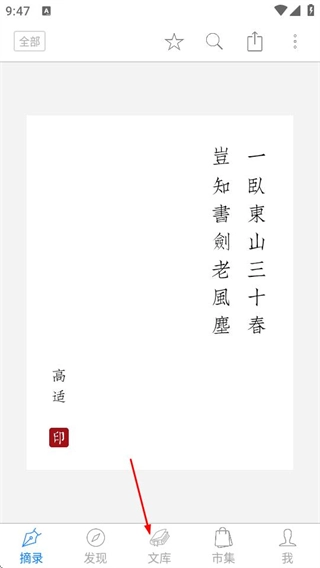 在诗词之美摘录页面,点击底部的文库选项,即可进入文库页面。