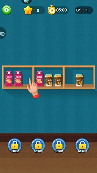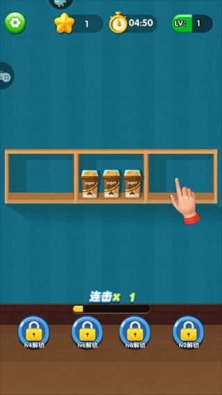 每三个相同的道具能完成一次消除,得持续消除才能清空一个货柜。