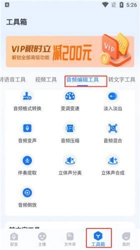 1、启动布谷鸟配音免费版,从底部进入“工具箱”,从列表中点击“音频倒放”。