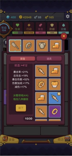 鞋子的种类和盔甲相同,均为五种,对应的属性分别是格挡率、格挡强度、闪避率、暴击率以及暴击伤害。