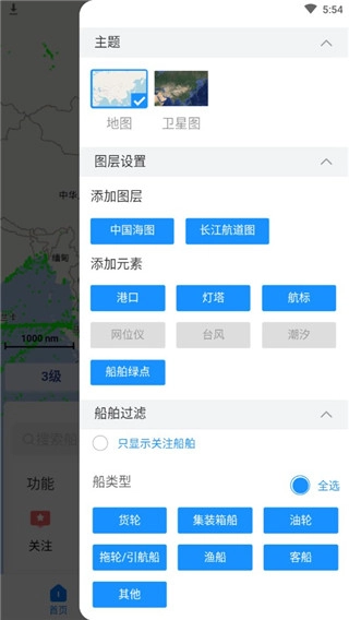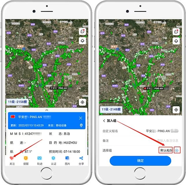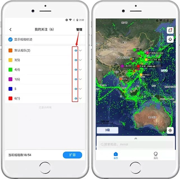点击右上角的“管理”按钮,再点击组右侧的“小眼睛”图标,即可在地图上显示所选组内的船舶。