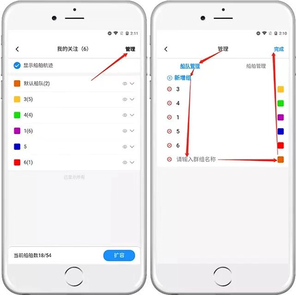 点击左下角的【关注】图标后,你可以点击管理,进入管理页面,选择船队管理,点击新增组,然后输入组的名称并选择组的颜色,点击完成即可创建好组。