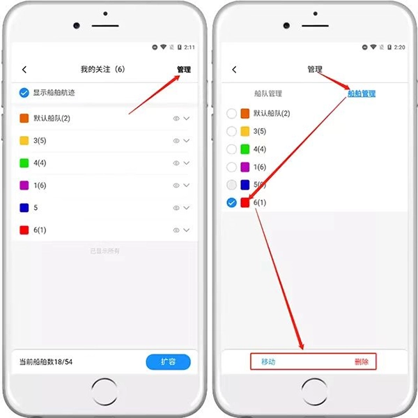 三、在船队里若需关注船舶的移动或删除操作,可点击右上角的“管理”按钮进入管理页面,接着点击“船舶管理”选项,选中需要进行移动或删除操作的组,最后点击“移动”或“删除”按钮即可完成相应操作。