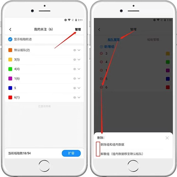 点击右上角的“管理”按钮,进入后选择“船队管理”选项;接着勾选需要删除的组,在执行删除操作时,可根据需求选择两种方式:一是删除该组及其包含的所有数据,二是解散组(此时组内数据会自动转移至默认船队)。