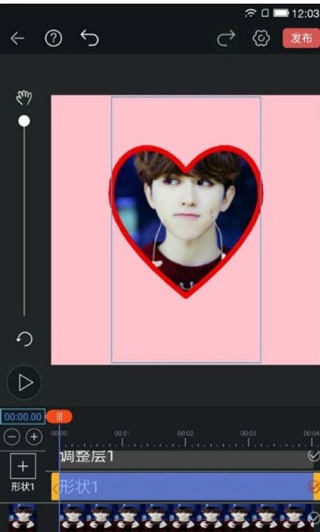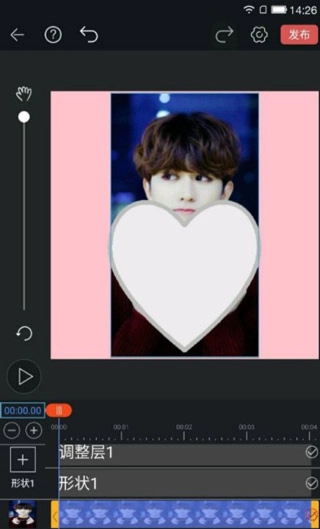 ②接着添加一张坤坤的图片,给这张图片加上一个爱心形状的遮罩,之后稍微调整一下它的位置,让它的大小和之前的形状保持一致。