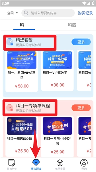 点击底部导航栏的“精选题库”按钮,就能购买VIP题库套餐或专项课程,其中包含科目一精选500题、考前冲刺等内容。