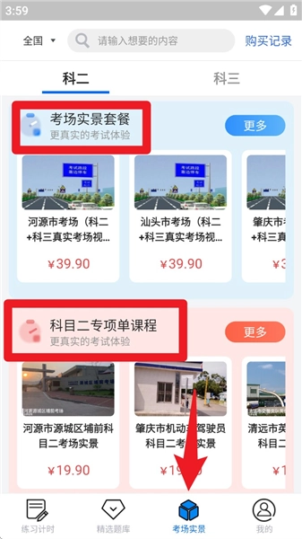 可以切换到“考场实景”页面,然后挑选科目二或者科目三对应的实景套餐,通过它能够查看真实的考场环境以及专项课程,这对考前准备很有帮助。