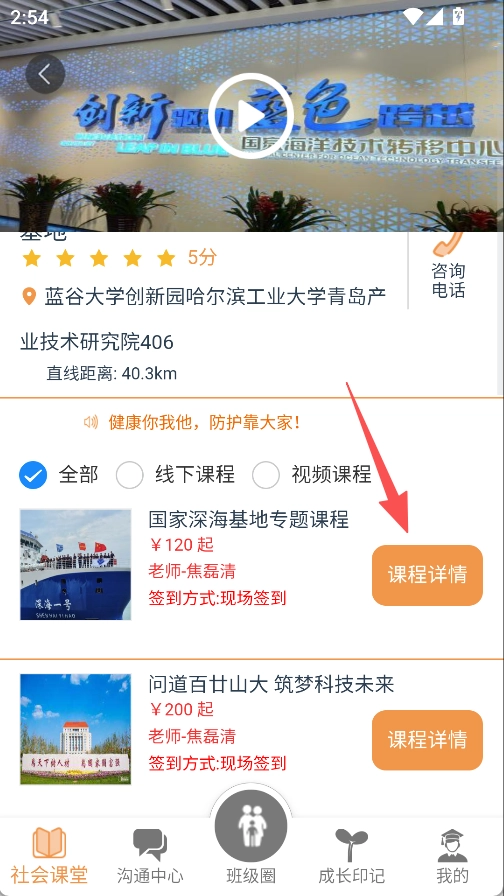 课程信息一目了然,点击课程详情能进一步了解课程内容,便于学生选择自己感兴趣的社会教育课程。
