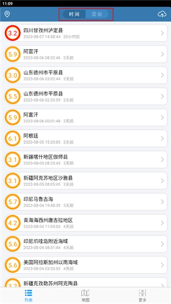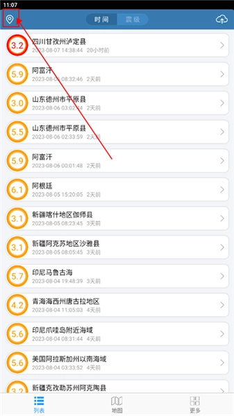在“列表”页面,找到你想查看信息的地区,还能按照时间和震级来查找;