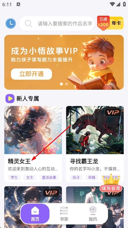 在小悟故事的主页面,找到并点击“精灵女王”,即可进入该作品的详情页面。