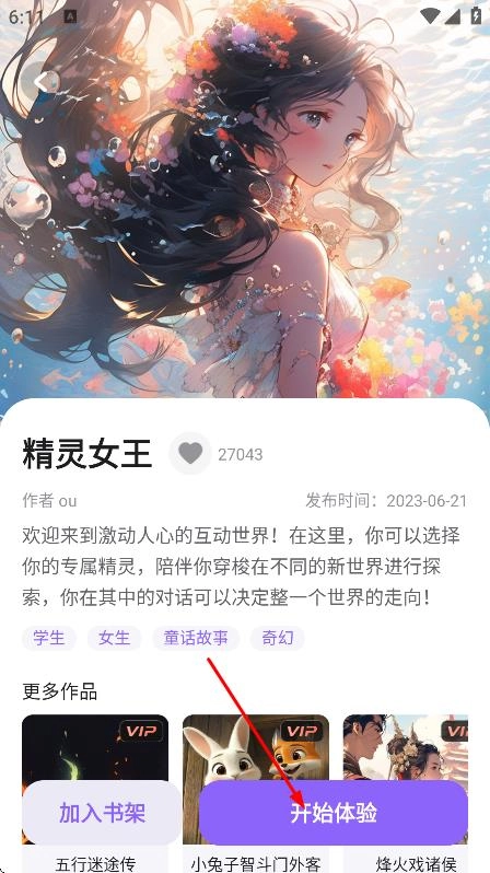 在精灵女王的作品详情页,点击“开始体验”按钮,即可进入互动故事页面。