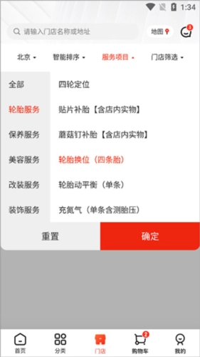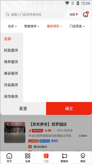 用户打开并登录后,进入门店页面,点击【服务项目】,在弹出的下拉选项里挑选服务项目,比如这里选择轮胎换位。
