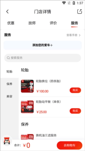 在打开的门店详情页面,切换到【服务】板块,找到之前选定的服务项目并点击【购买】按钮。
