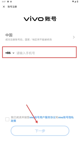 请输入您的手机号码,勾选“同意用户服务协议和隐私政策”选项后,点击“下一步”按钮,以继续完成注册流程。