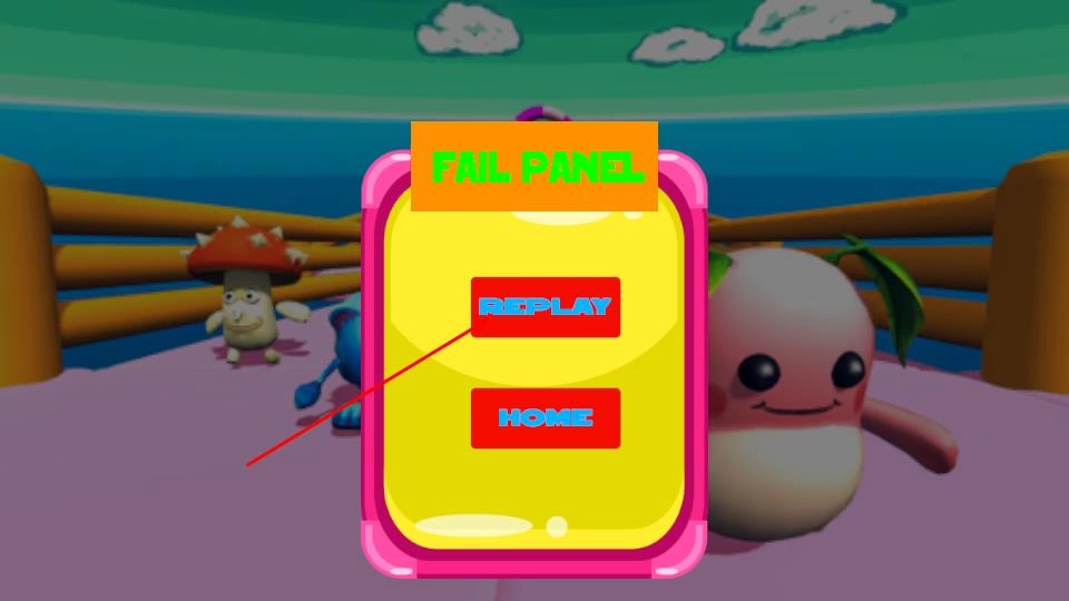 要是比赛没赢,就会出现FAIL PANEL提示框,这时候可以选REPLAY按钮重新挑战,调整策略再尝试一遍;也可以点HOME按钮回到初始界面,争取下一次能顺利到达终点。