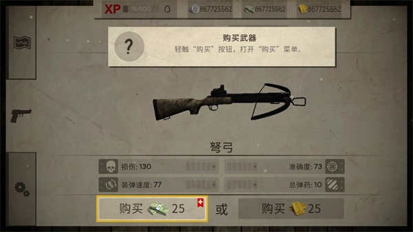 进入军械库后,若要获取武器需进行购买操作,点击“购买”按钮即可完成。