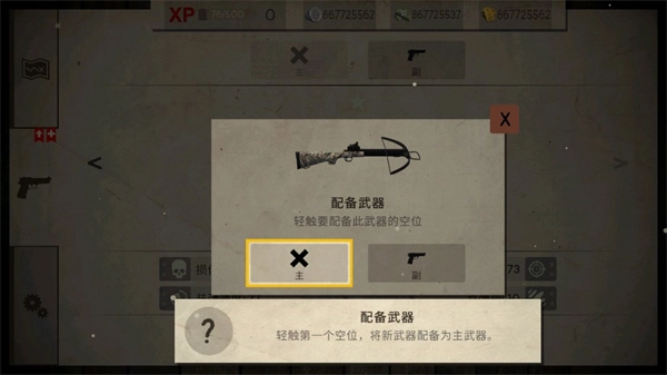 接下来需要配备新购买的武器,点击“配备”按钮。轻点第一个空位,把新武器设置为主武器。