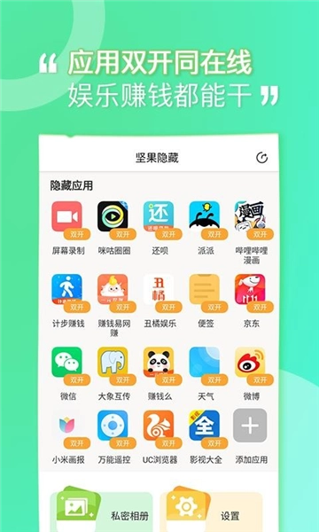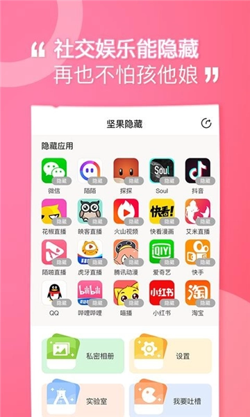 坚果隐藏是深圳市前海快付数据服务有限公司开发的系统安全工具,用户通过它能把手机里的应用隐藏起来,妥善守护个人隐私。不少时候我们都希望手机里的某些应用只有自己能访问,不管是照片还是视频这类内容,既想正常使用应用,又要精准保护隐私,这里有超多伪装界面可供选用,切换不同界面使用也是个很不错的体验。它整合了应用隐藏、文件加密、云存储等功能,用多种方式助力用户保护私密信息,让使用更安心;公司重要文件、个人隐私照片、私密视频资料等都能存进来,还能按资料类型分类,方便用户快速找到需要的文件;另外还配备了手机应用隐藏模块,让手机里的应用只有自己知晓,最大程度保障了用户隐私。