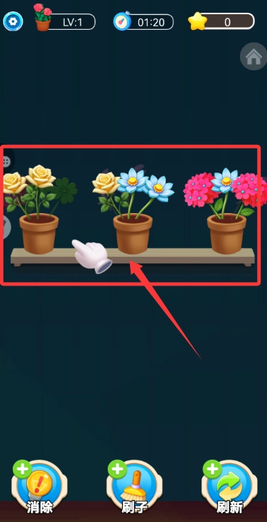 通过拖拽操作,把三朵相同的花卉移到指定区域就能完成消除,在限定时间内将所有花朵都清空就算顺利通关。