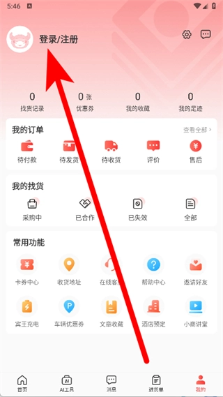 在个人中心页面里,找到并点击登录注册区域,进入登录注册界面。