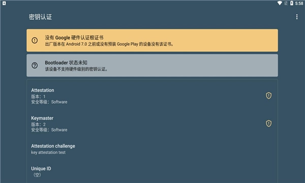 密钥认证原名Key Attestation,是一款专业的手机身份锁应用。用户可通过它为手机设置安全锁,使用手机时需先完成身份认证,只有认证通过才能正常使用,这样能有效保障手机数据安全,防止隐私泄露。感兴趣的用户,欢迎来体验密钥认证!