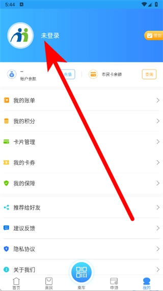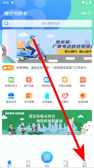 打开南宁市民卡应用后,点击底部导航栏最右边的“我的”选项,就能进入个人中心页面了。