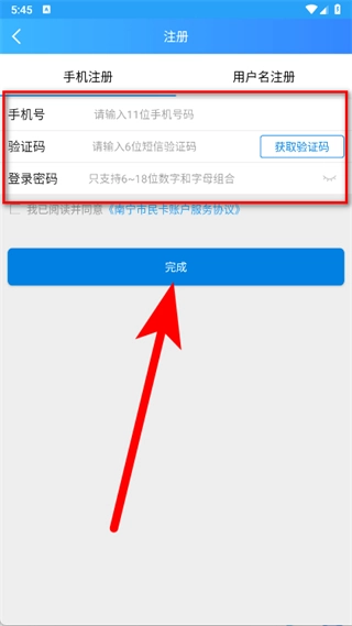 请输入11位手机号码,接着点击“获取验证码”按钮,随后点击“完成”按钮,即可完成账号注册流程。