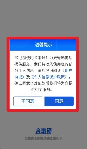 首次打开金事通App时,需仔细阅读《用户协议》与《个人信息保护政策》,点击“同意”按钮后,才能继续使用该应用提供的服务。