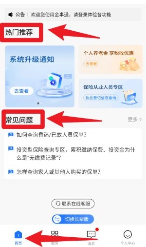 点击底部“首页”,即可查看热门推荐、系统通知、养老金信息以及常见问题,便于快速掌握核心资讯内容。
