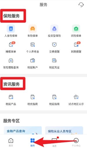 进入“服务”栏目即可使用保险服务与资讯服务功能,涵盖车险、睡眠保单、交费提醒、税优指南等各类项目。