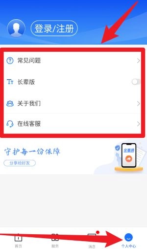 点击“个人中心”,您可以查看或编辑个人信息,还能访问常见问题、联系客服、切换长辈版界面,享受更便捷的服务通道。