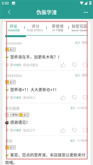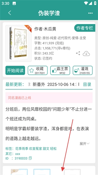在《伪装学渣》的详情页面,你可以查看这本书的相关信息,向下滑动页面就能进入评论区。