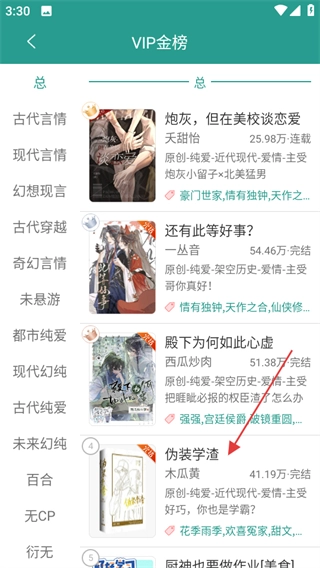 在VIP金榜页面找到《伪装学渣》这本书,点击进入它的详情页面。