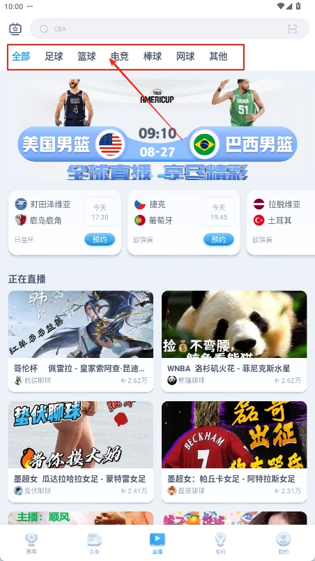 点顶部搜索栏搜赛事,选CBA或电竞等分类。