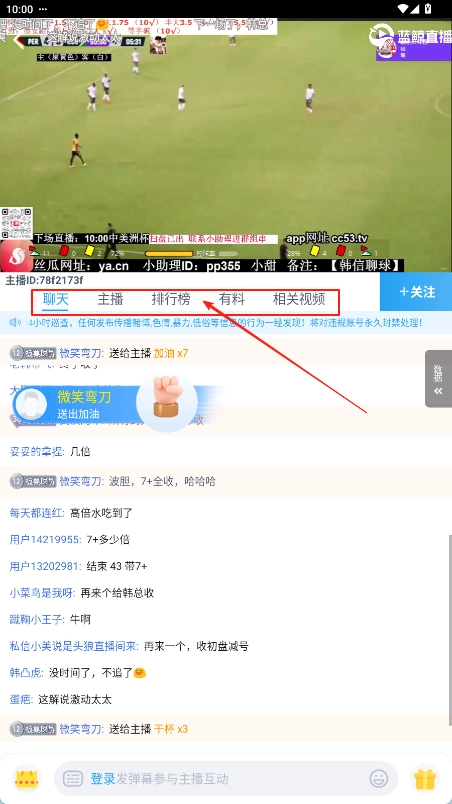 观看足球直播时,可点击下方的聊天等功能标签,发送弹幕进行互动。