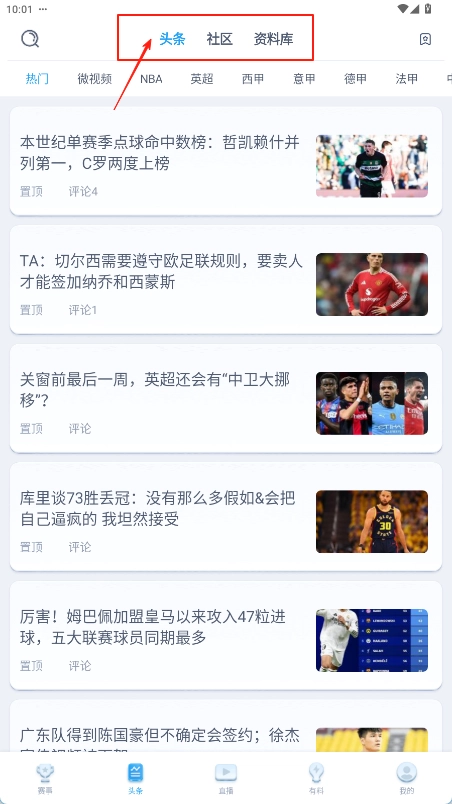 在首页搜框旁点头条,浏览足球篮球热讯。