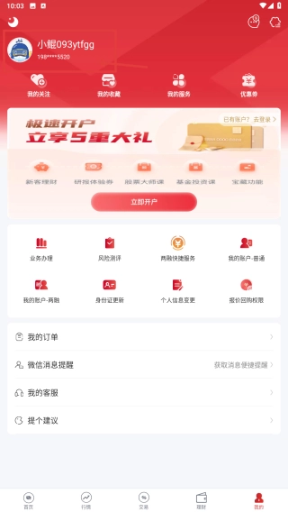 打开证券类应用,点击底部的“我的”选项,进入个人中心页面。