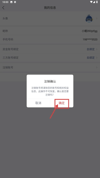 在注销确认弹窗里,点击确定按钮,就能完成账号注销的操作。