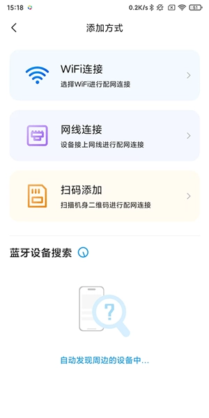 请先确认设备已进入开机配对状态,之后可通过蓝牙搜索进行连接,此外也能选择WiFi连接、网线连接或扫码添加等方式完成设备接入。