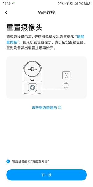 当使用WiFi进行连接时,需要对摄像头进行重置操作。首先接通设备的电源,随后耐心等待摄像机发出“请配置网络”的语音提示。