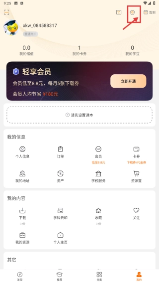 打开教育类应用后,点击底部导航栏的“我的”选项,即可进入个人中心页面。