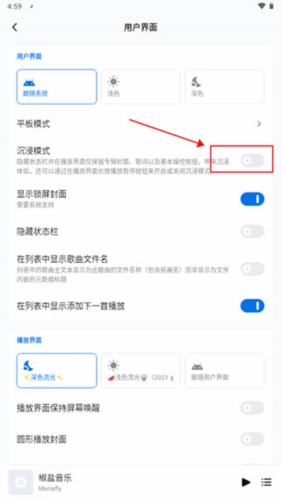 在用户界面设置里,找到沉浸模式选项,点击其右侧的开关按钮,具体操作可参照下图: