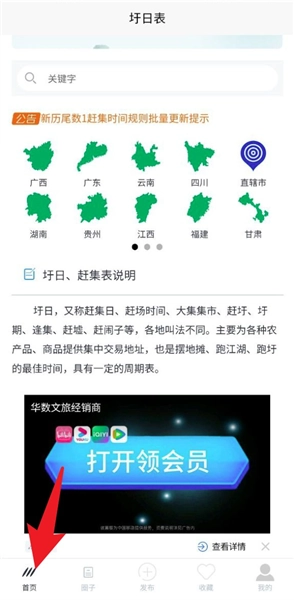 打开圩日表App后,系统会默认进入“首页”模块,在该页面下滑就能浏览到各省的圩期地图,点击相应省份即可查看当地详细的圩表信息。
