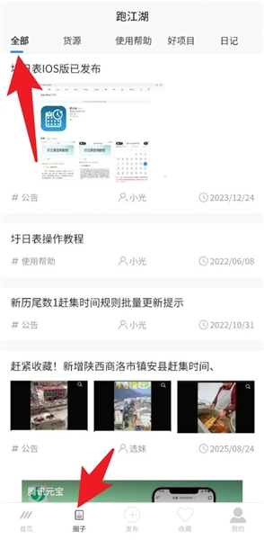 切换到“圈子”标签页后,就能浏览圩日相关的资讯、公告以及使用教程,点击上方的分类还可以筛选内容类型。