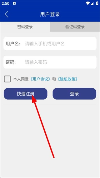 在用户登录页面,点击快速注册按钮,即可跳转至用户注册页面。