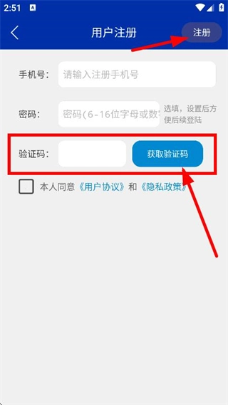 之后获取验证码并填写,点击注册按钮,完成账号注册流程。