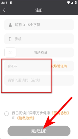 输入你收到的验证码,若有邀请码可选择填写,之后点击完成注册按钮,就能走完注册流程了。