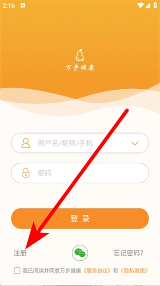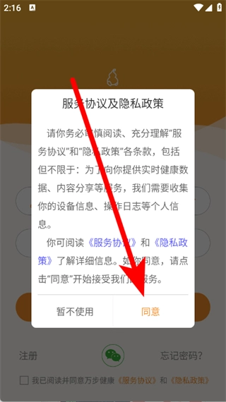 打开万步健康应用,当出现服务协议和隐私政策的弹窗时,点击同意按钮。